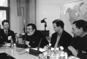 From Left, Vincuk Viacorka (Supolnasc Civil Society Center in Belarus), Miljenko Dereta (Civic Initiatives in Serbia), Eric Chenoweth (IDEE), and Ivlian Haindrava (Civic Development Center-Georgia) at a Centers for Pluralism meeting in Budapest (2001).