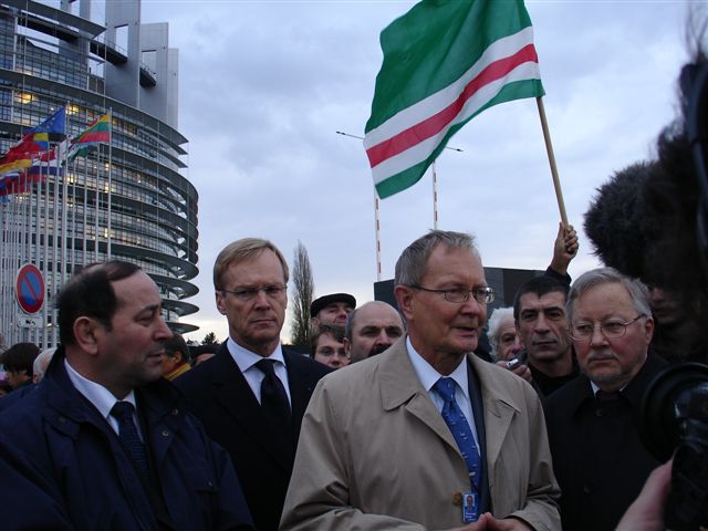 Tunne Kelam and Vytautas Landsbergis, Members of the European Parliament, at a demonstration protesting the Russian war against Chechnya (2003).