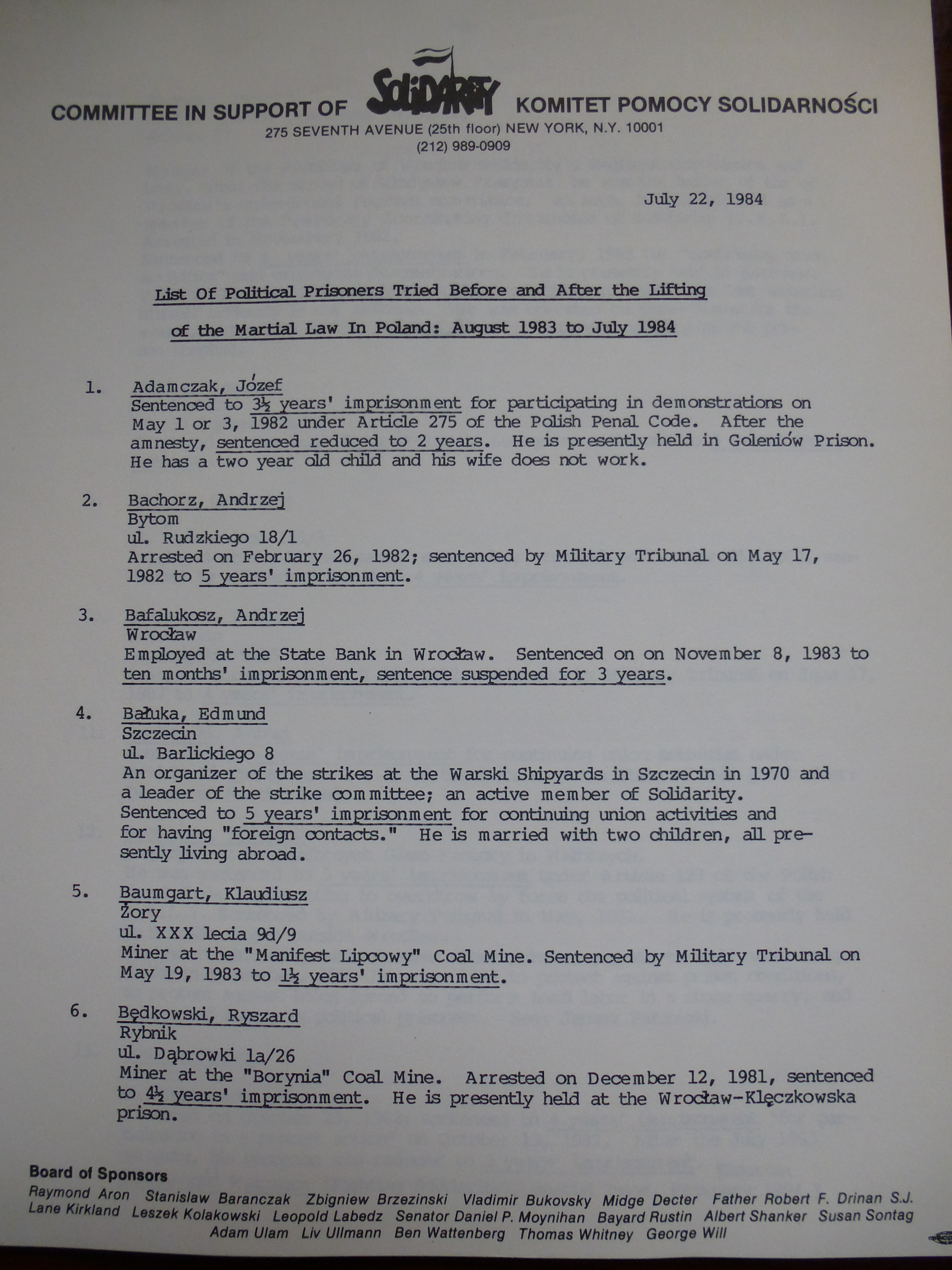 A list of political prisoners in Poland, July 1983-July 1984, showing the extent of repression after martial law was supposedly "lifted."